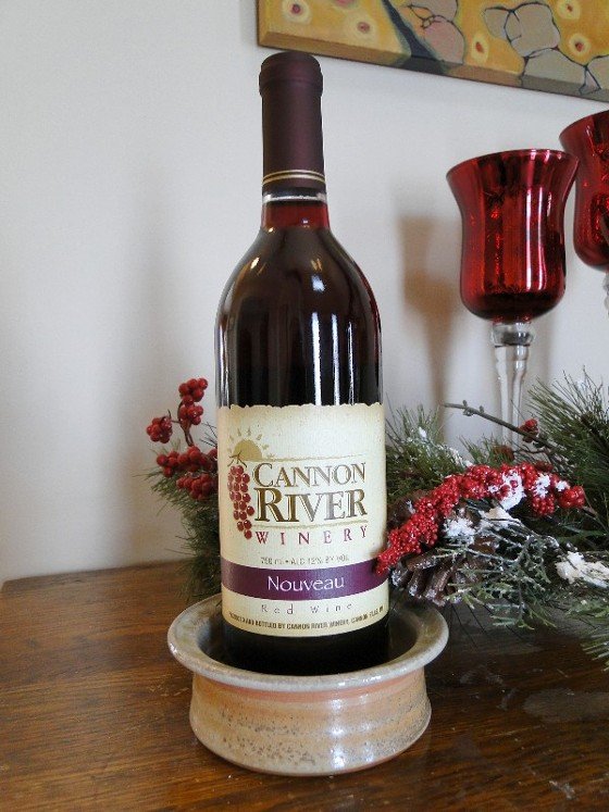 My Holiday Open House and Sale is this weekend, running Friday, December 2nd (4pm – 9pm) and December 3rd (10am – 6pm) with lots of pottery and handmade soaps, body butters and bath fizzies for your holiday and hostess gift needs. The location information is in the right side bar. One open house attendee will win this bottle of Cannon River Winery Nouveau and the wine bottle coaster shown below.