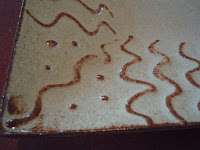 My last post had a photo of a square plate I’d done a slip trail design on. Well, here’s the same plate all glazed up. The glaze is a rust color where it’s thinner over the slip and a soft cream color where it’s thicker.