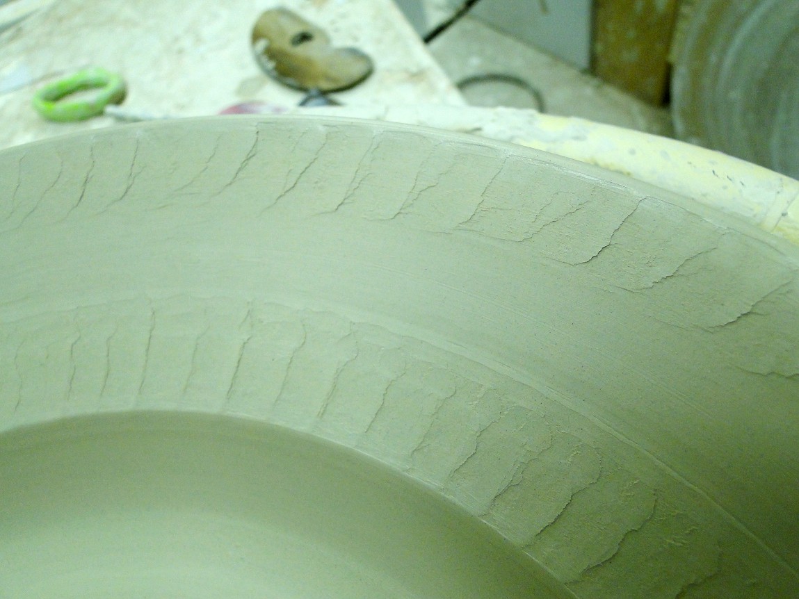 While using a rib to lay down the rim, the rib started to chatter and created this awesome texture on the rim. Not exactly something I was going for, but I think it will look really interesting when the piece is glazed.