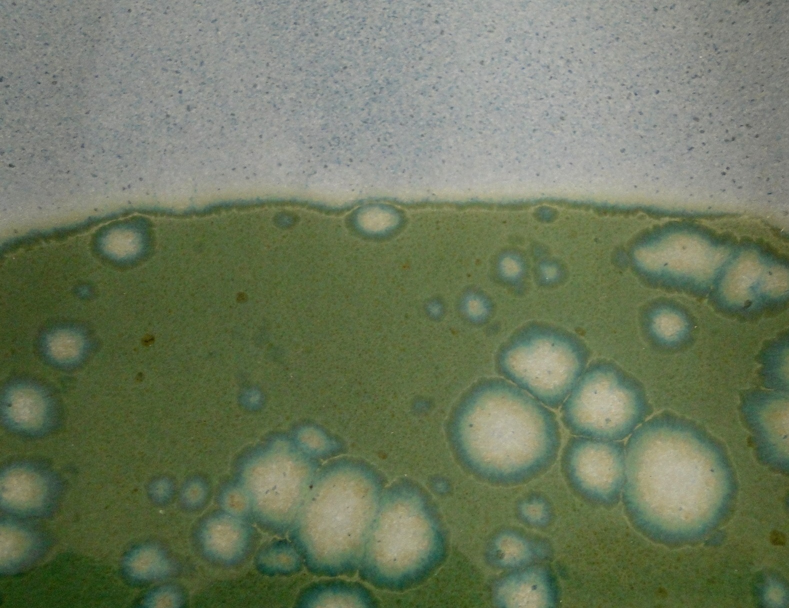 The photo below is a close up of the grass green and bright sky blue glaze combination I’ve used on a rectangle platter. I love how the blue on the green give it a watery look.