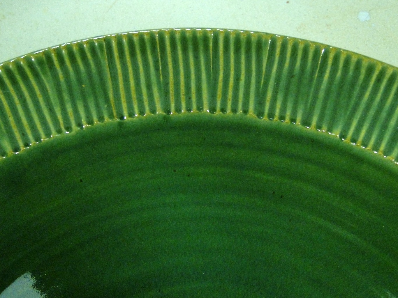 On the pottery front, I unloaded another glaze load today. A while back I’d mentioned changing my clay body and hoping to focus on more colors in my cone 6 work. The lighter, smoother clay body works really well for texturing pieces. And the brighter colors break well over the texture. Here’s the rim of a large bowl glazed in the deep grass green glaze.