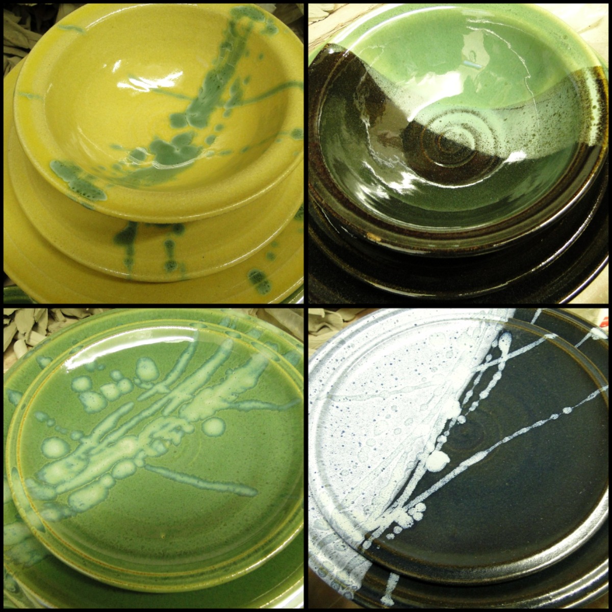 After our second day of snow and a sort of frustrating day at work, I arrived home to a kiln that was cool enough to unload (it’s a little unusual for me to wait that long). This load had several sample place setting that will be going to Stones Throw Gallery in St. Peter. The yellow one was a little disappointing, but the other three look great. The yellow glaze looks great on a white clay, but on the buff colored clay this place setting is made from it isn’t as appealing to me.