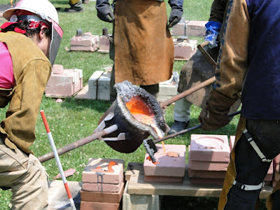 When the iron was melted, it was drained from the furnace into a bucket like thing with handles on both sides. Two people carried the molten iron to a line of mold and poured the iron from the bucket into the hole in the top of the molds. The entire process is super hot, they have to wear heavy protective equipment to prevent burns and to top it off it was in the mid-90s that day.