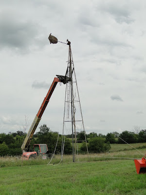 We rented a forklift to unload the bricks and fortunately, the rental place delivered a large one than we needed, but didn’t charge us for the upgrade. We took advantage of the larger lift to upright our old wind mill that had been down since we had some well work completed. Yah! It still need some work, but for now it is standing and that’s a big, difficult step. Amazingly, the grape vines that had been growing on it previously made it through all the moving and are still hanging there.