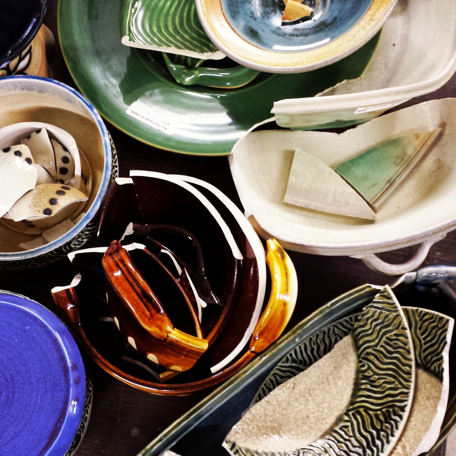 To transport the pots home for the sale, I packed them in bins in the back of the truck with bubble wrap and newspaper between the pieces. I transport pots like this all the time with no problems. HOWEVER… I’ve never gone over a speed bump quite like the one I experienced in the parking lot of a craft shop I stopped at to quickly pick up some ribbon for the ornaments in the firing. It was a monster of a bump. Upon unpacking the pots, here is what I found.