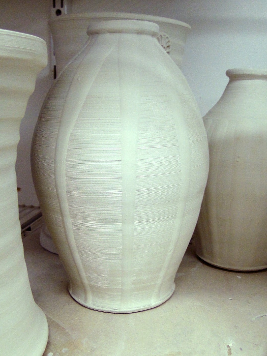 This past weekend, I made several bottles and vases with slip stripes down the sides. I’m getting ready for a second firing of the wood kiln the weekend before July 4th and I’m hoping to have more of these made for that firing. Also in the background of the vase are a few oblong vases with a stamped decoration on the front.