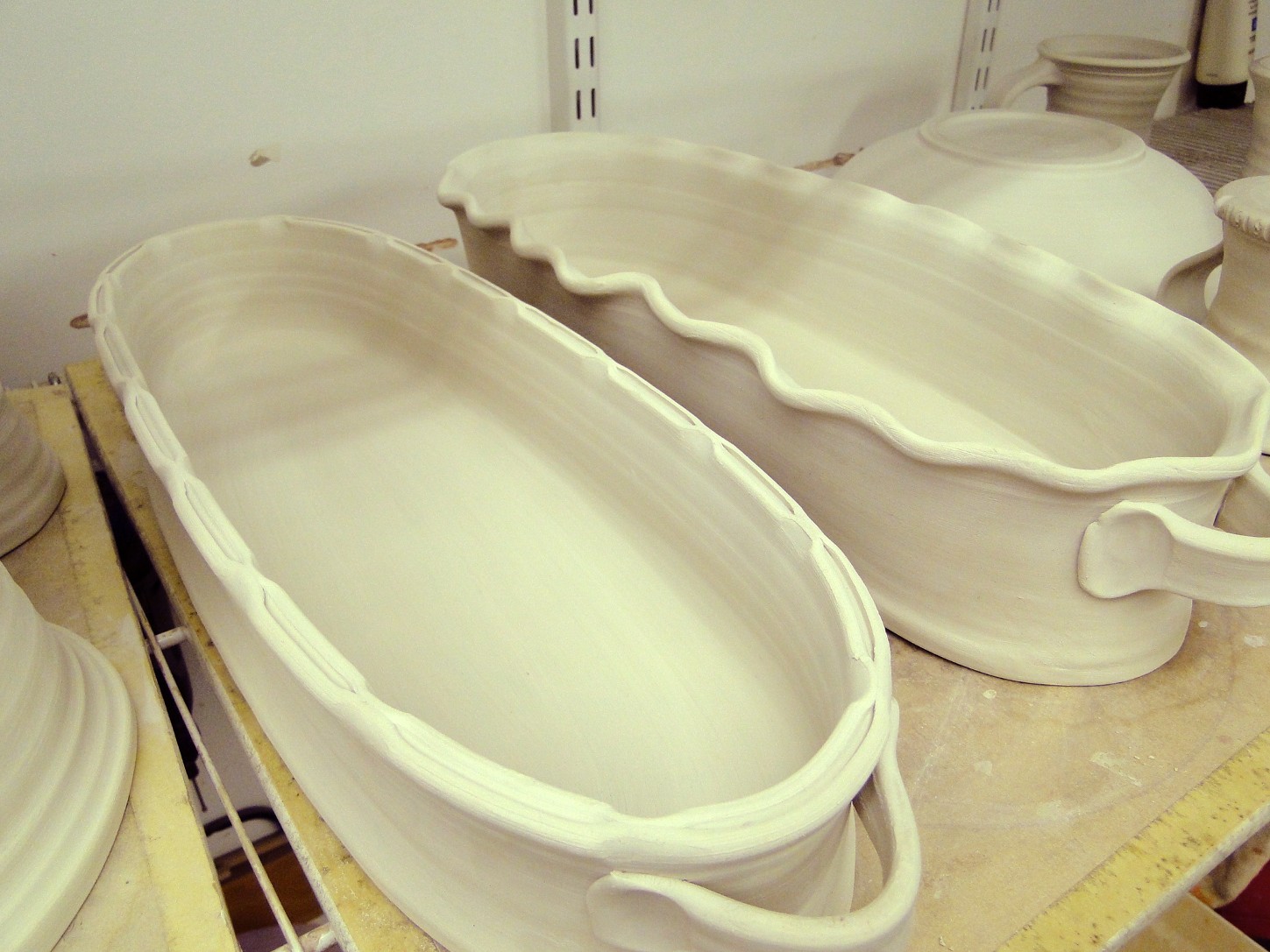 With the arrival of spring, I’ve started the time of year characterized by very little time in my home studio and more time spent at the farm studio. Here are a few oblong pieces I made a week ago at the farm. They’ve been drying slowly so as not to develop any cracks. We’ll see how that plan worked after they’ve been bisqued. These are about 15″ – 16″ long. One has a ruffled rim, while the other has a split rim. They are fun to make.