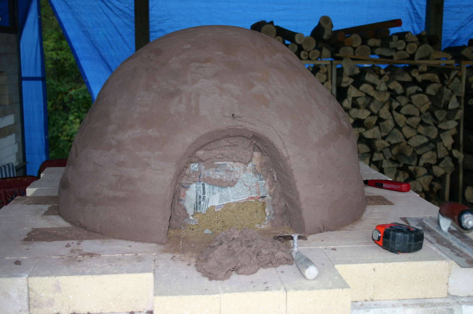 Then it was time for the next layer of mud. This layer was a combination of clay, crushed insulating fire brick and straw. It is a little thinner than the first layer, but will be covered with yet another layer in the coming week or two.