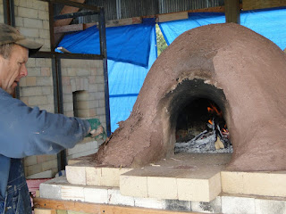 Kevin spent a little time carving a door from a large piece of oak . When baking in the oven, you keep a fire going for a couple hours to heat up the mud and bricks, then remove the fire and use a door to keep the heat while you bake for a couple hours.