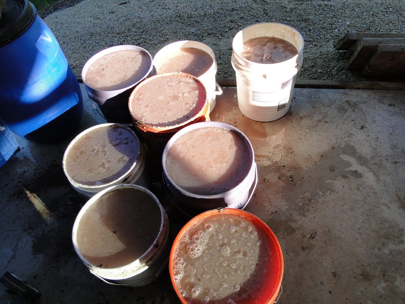 With the base completed, this weekend we began with construction of the oven by soaking a hundred pounds of clay shavings left over from trimming my pottery in buckets of water to rehydrate the clay to be used in the inner layer of the oven.