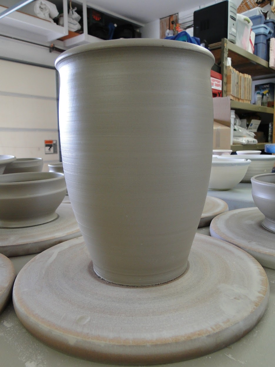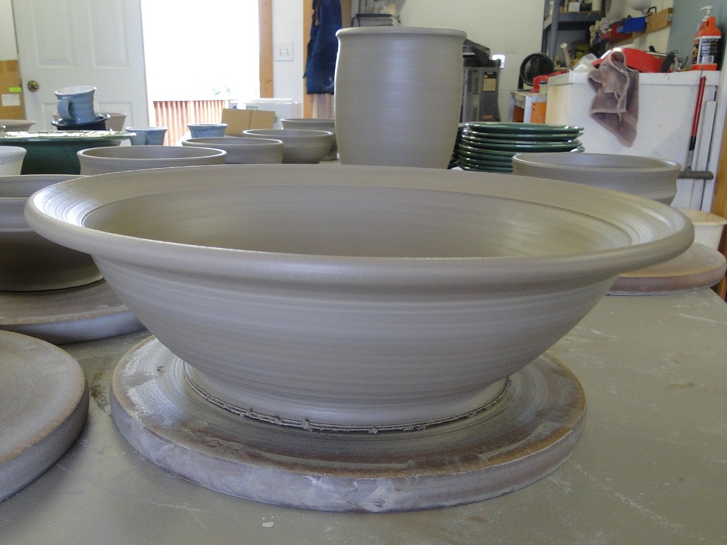 Anyway, in addition to several medium size bowls, cups and wine bottle coasters, I threw a few large pieces today. Not sure if they’ll be dry in time to bisque before the firing, but I’ve got my fingers crossed. I could really use a little help from the weather – NO MORE RAIN!!! Please