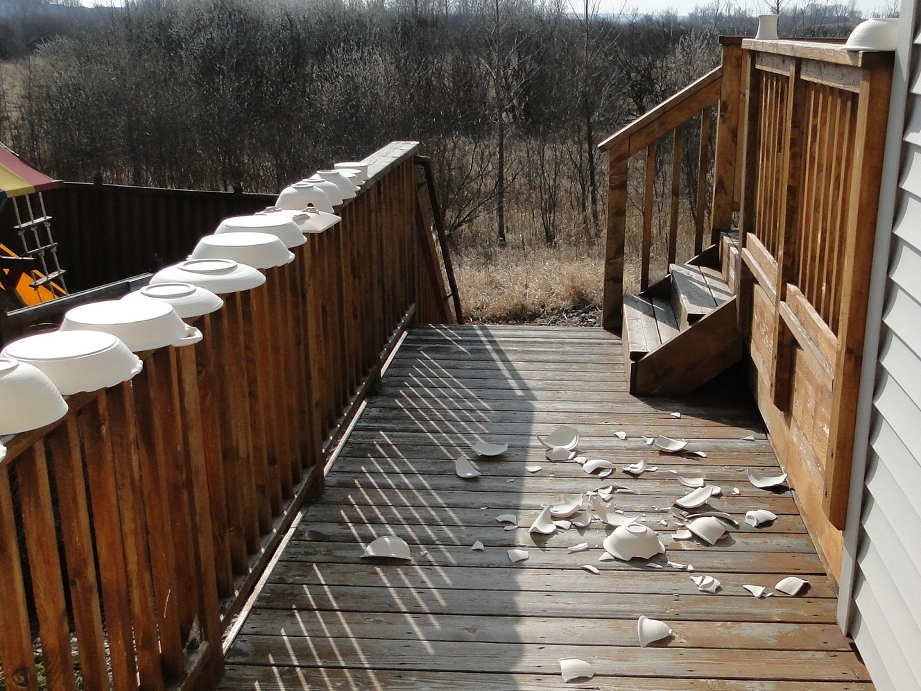 Even when you just think you are making a quick trip to take Mom to a friend’s house (20 minute trip tops!!), don’t leave just cleaned pottery on the deck railing to dry off before waxing. I should have known better – it’s a little breezy here today.