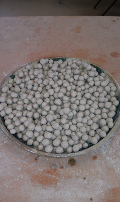You might wonder what a person does the day after a 24 hour kiln firing? Well, after the best shower in the world and a post firing nap, I had to deal with my excess pot wadding. I seem to have this nearing neurotic fear of not having enough wadding so I always make too much. While that normally might be considered a good thing, my wadding mix has oat bran in it that causes the wadding to get nasty smelly and furry in just a couple days. I don’t usually find the excess wadding until a couple weeks later when it’s absolutely gross. But not this time, I spent my post firing afternoon, making little wad balls, hoping I can get them to dry before they go bad. Sad huh?