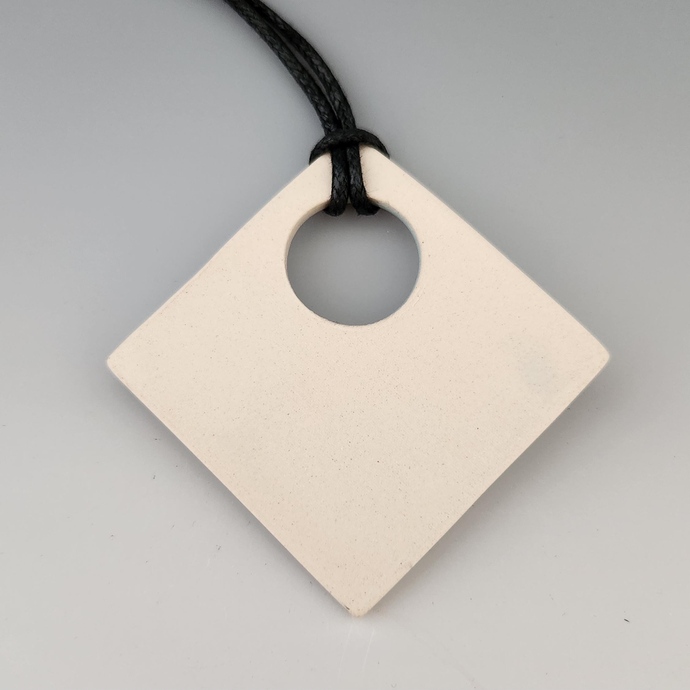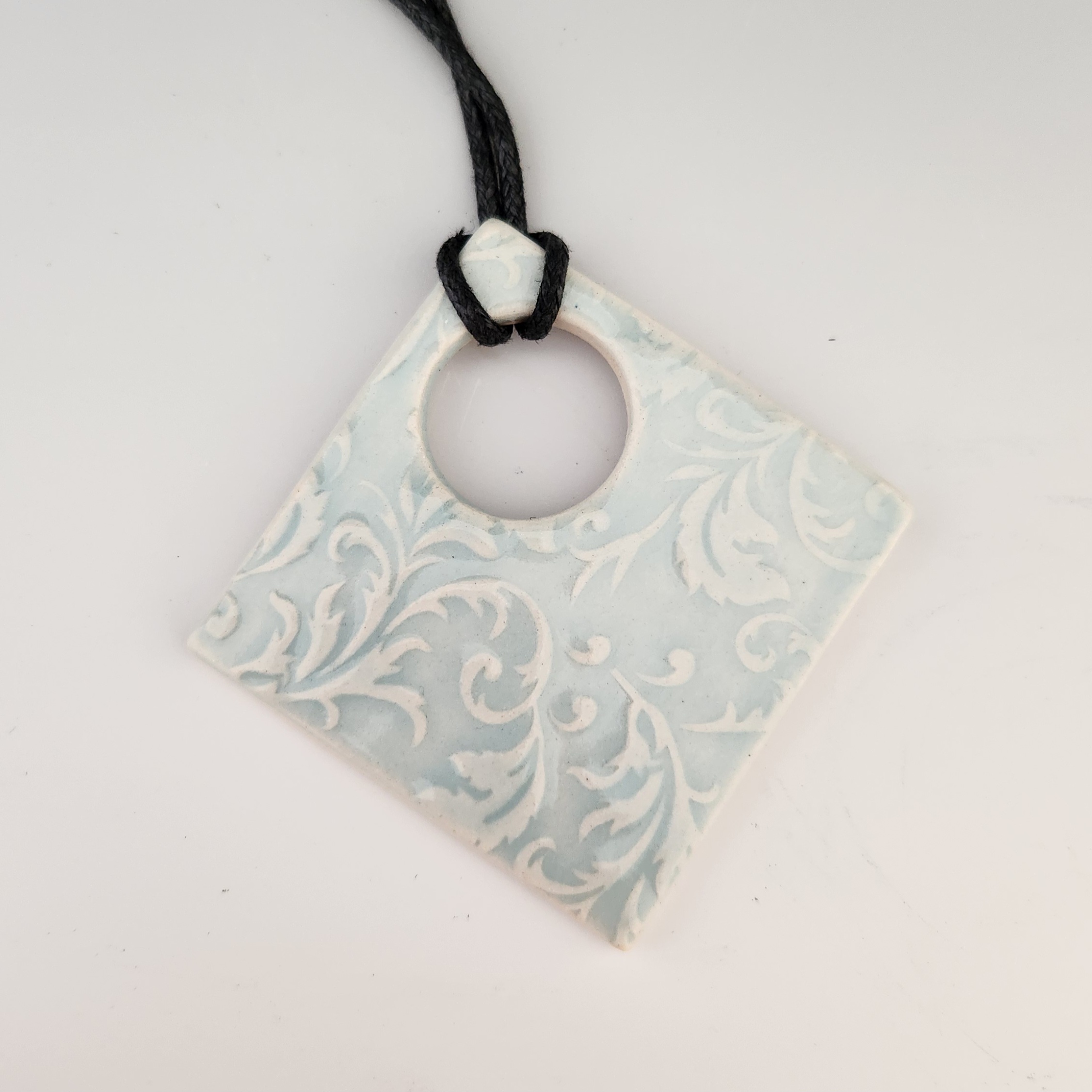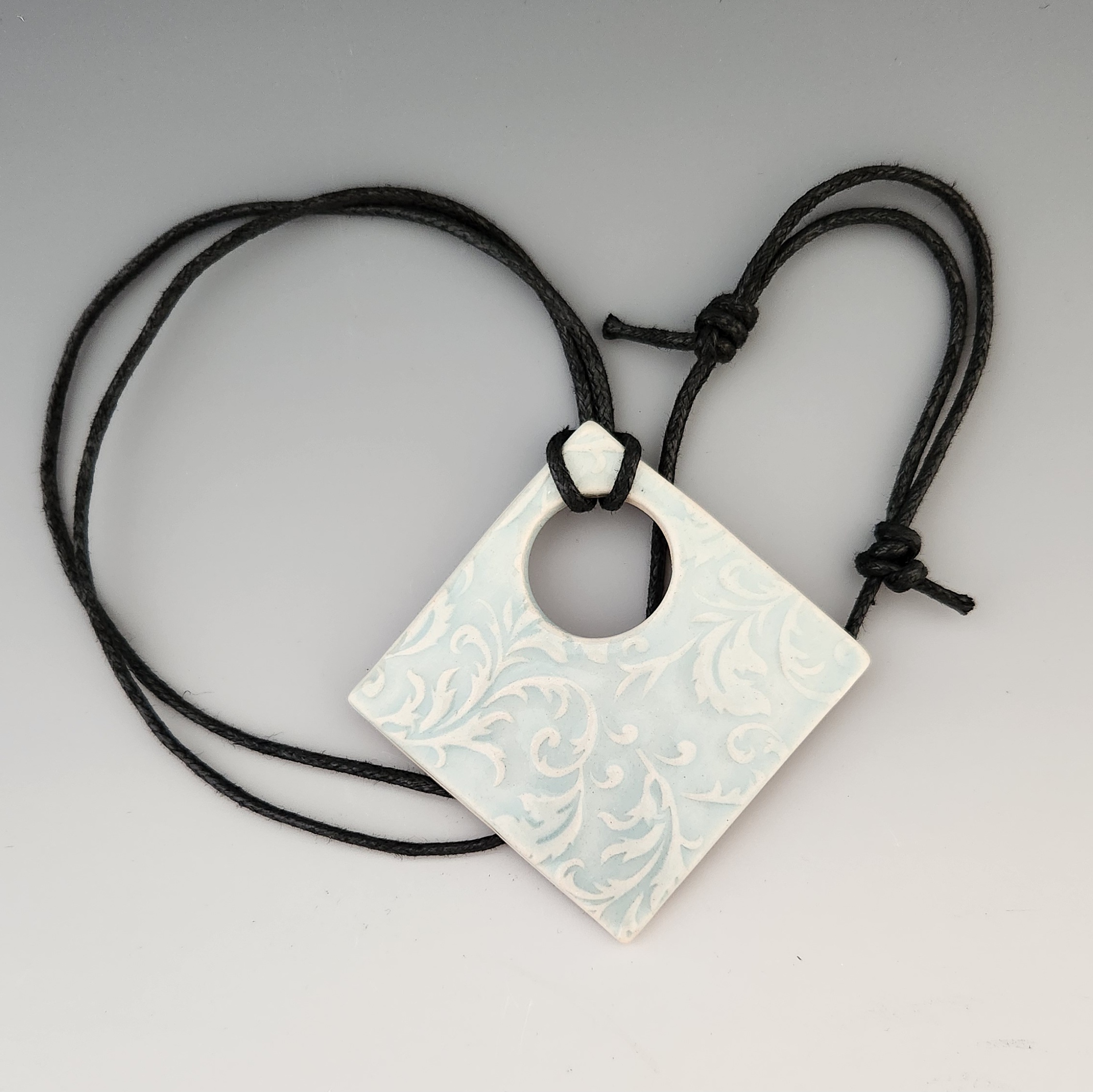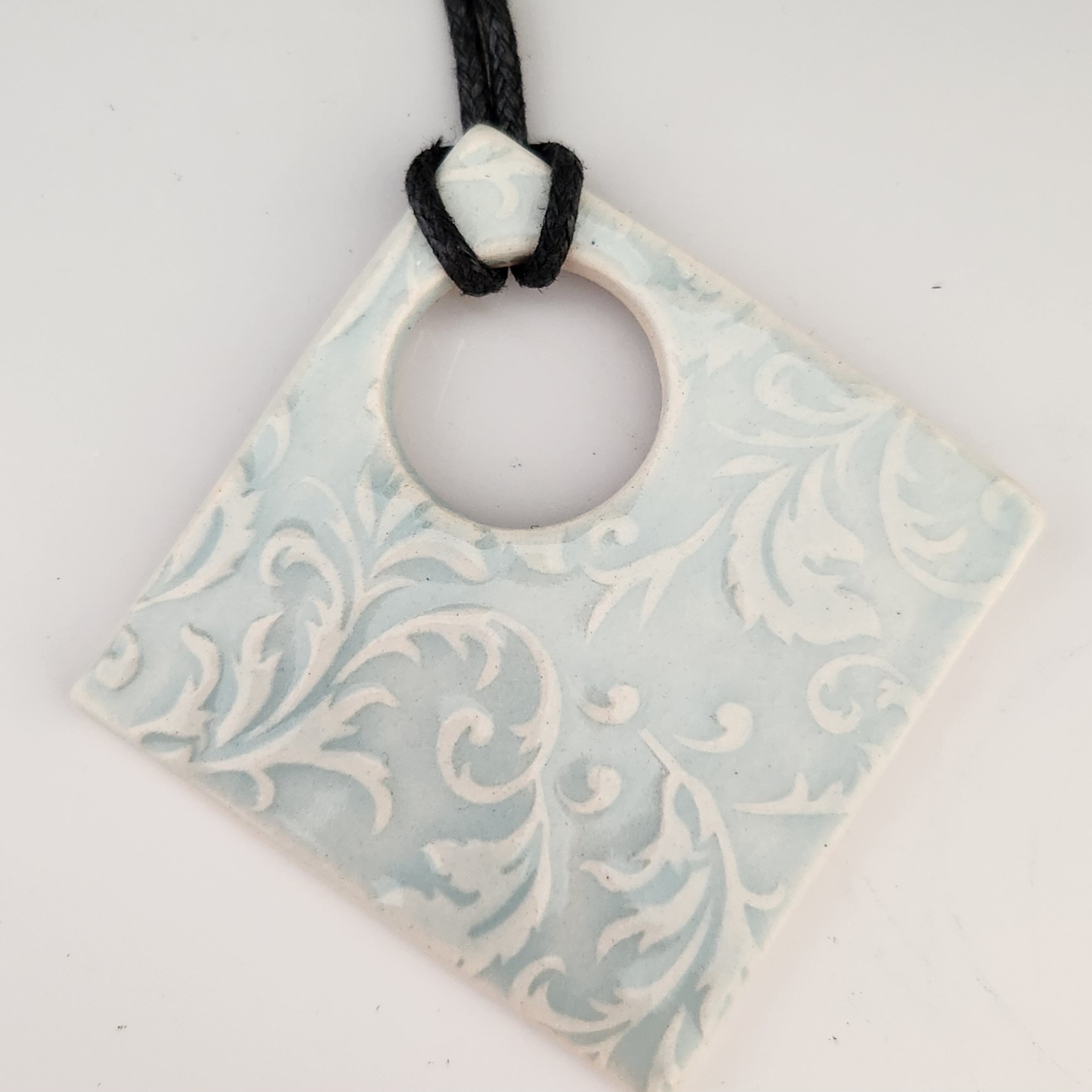2″ textured pendant with adjustable waxed cotton cord. Glaze on the textured side is a pale celadon blue green color; the opposite side is unglaze.