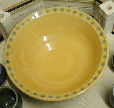 Since there was an extreme lack of sunshine here in Minnesota today, I had to peek in the cooling kiln to get a glimpse of something bright. This large yellow bowl is the closest thing to sunshine I’m gonna see today. And its still warm enough to feel like sunshine (probably should have been a little more patient before unloading).