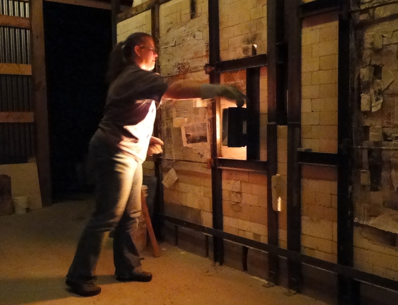 Last Sunday, I joined an amazing group of potters doing a woodfire at friends Donovan and Colleen’s studio. I put a couple pots in their firing to test some glazes I’d like to use in future wood firings. Last night the first chamber was being held at cone 10 while the the soda chamber was stoked to bring it up to temp.