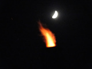 When we were leaving last night I snapped this photo of the flames from the chimney and the moon.